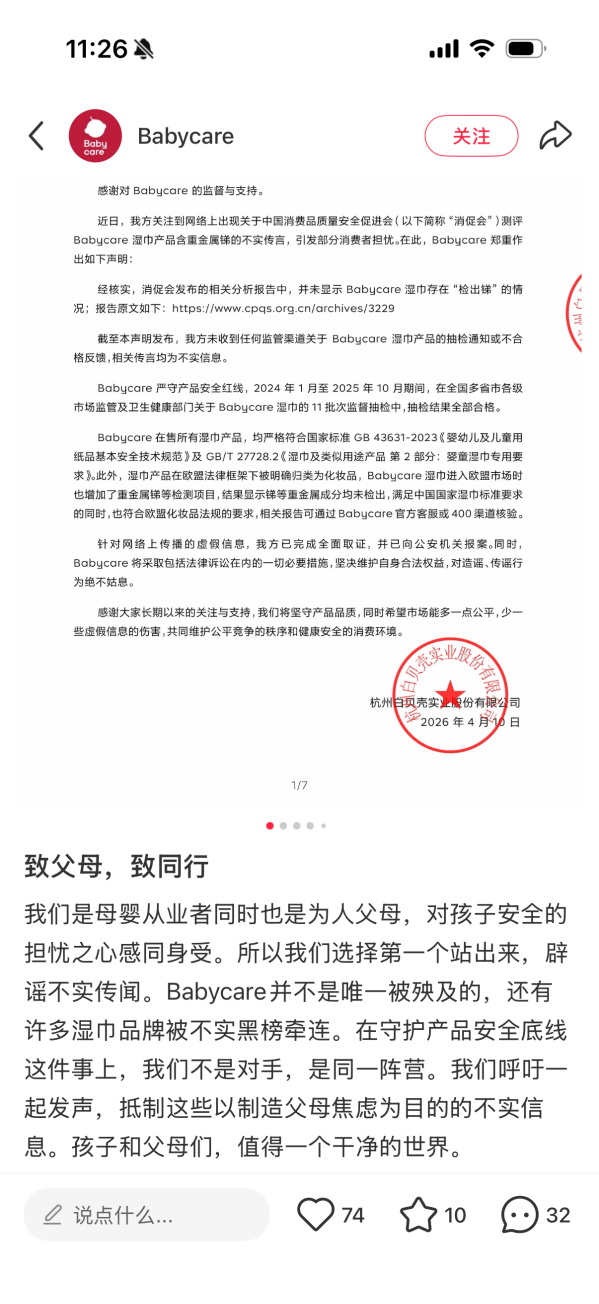 4月11日,国内头部品牌Babycare发布声明,辟谣近期社媒上传播的“消促会测评Babycare湿巾产品含重金属锑”等相关传言为不实信息。