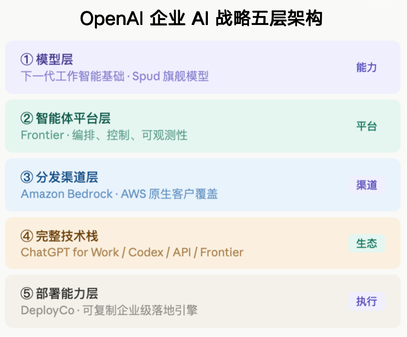 OpenAI想要做的是企业AI的操作系统。就像当年微软把Windows做成了所有企业IT基础设施的底层一样。Dresser在文中反复强调的词是\"平台\"。她说,客户要的是平台,不是点状解决方案。ChatGPT for Work是知识工作的入口,Codex是开发者端,API是集成引擎,Frontier是智能体编排层,Amazon runtime是生产级有状态运行时。五个产品,五个入口,理论上客户从任何一个门进来,最终都会被引导进入完整生态体系。